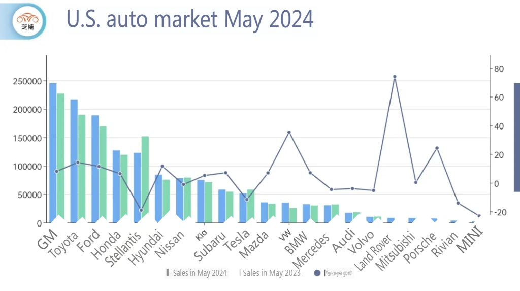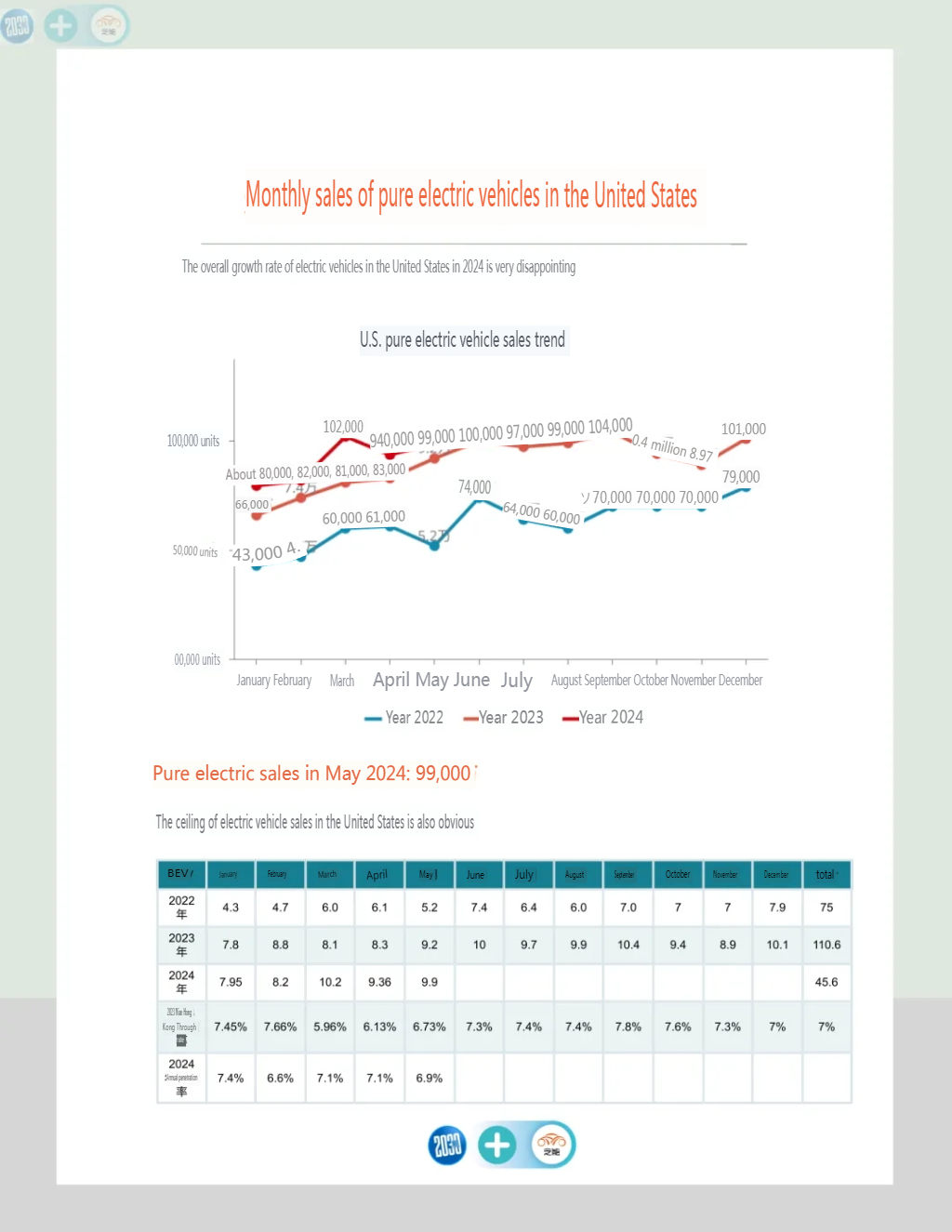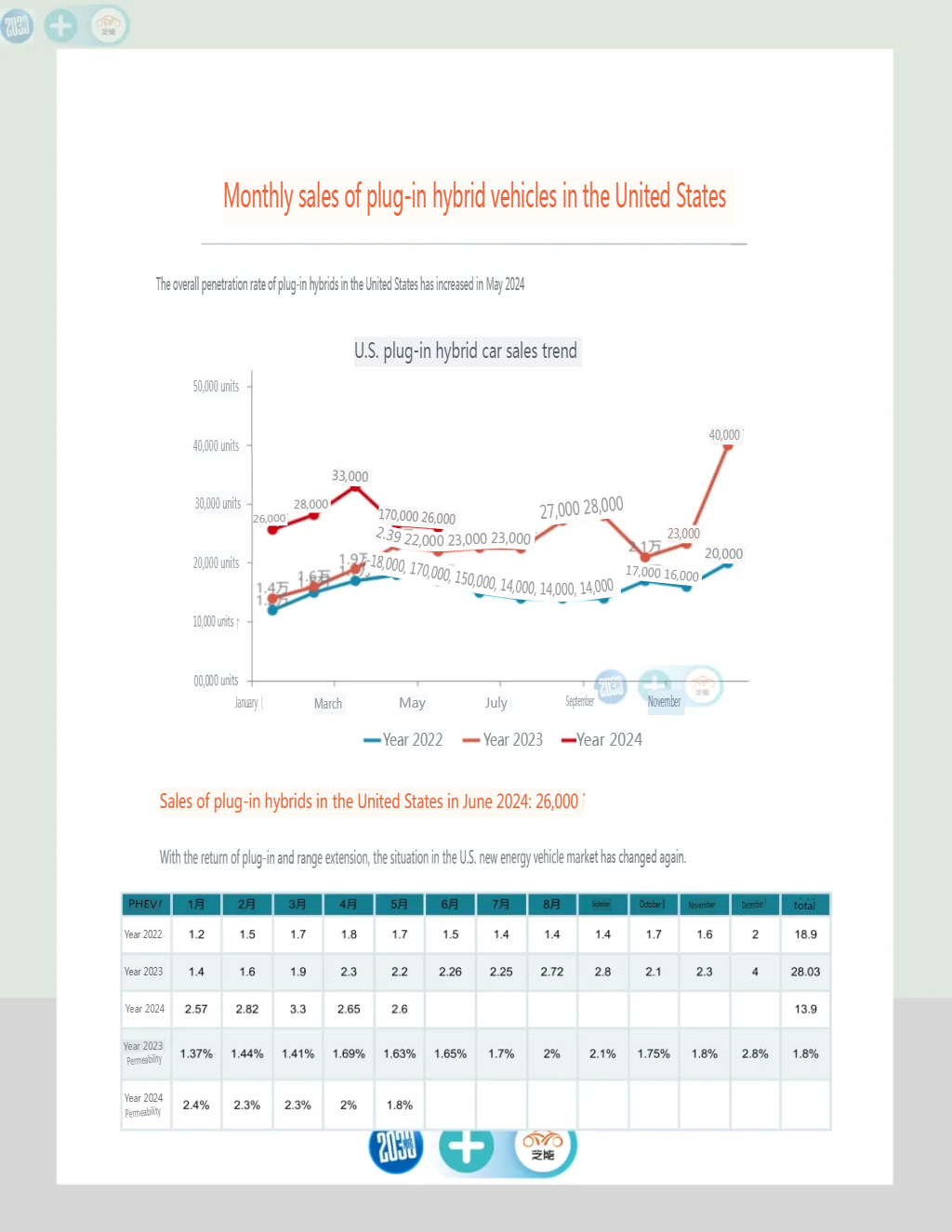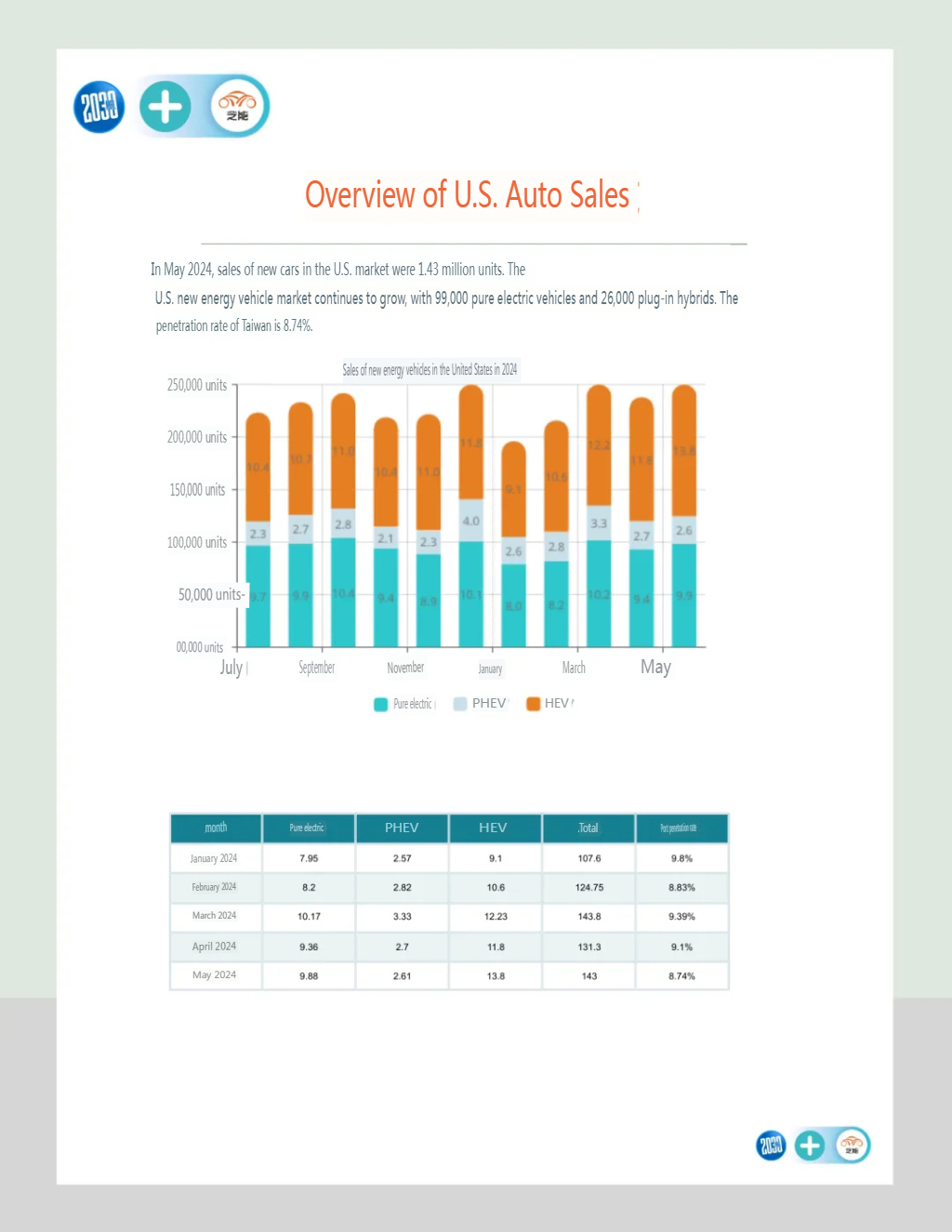 In May 2024, the sales of new cars in the US market were 1.43 million units. The new energy vehicle market in the United States continues to grow, with 99000 pure electric vehicles and 26000 plug-in hybrid vehicles, with a penetration rate of 8.74%.
