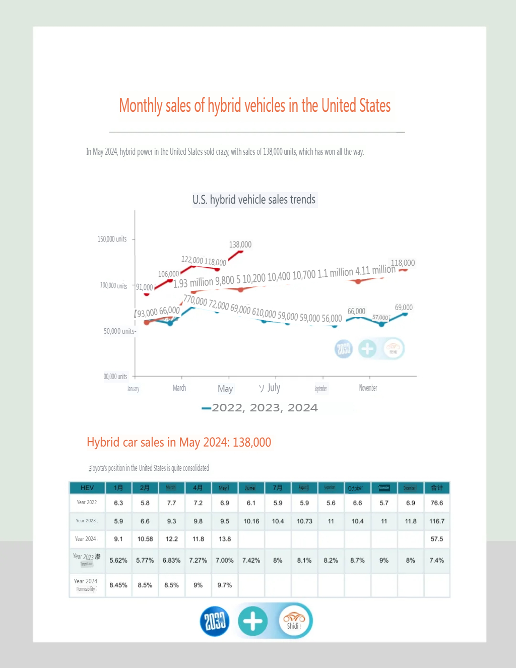 In May 2024, a total of 138118 hybrid vehicles were sold in the United States, including 34959 sedans and 103159 light trucks (LTs), a year-on-year increase of 33.0%. This month, Toyota accounted for 47.3% of the total sales of hybrid vehicles.