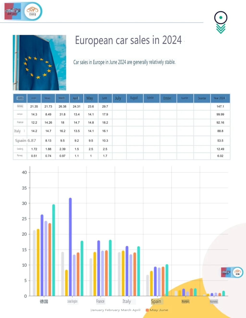 In terms of total volume, the sales of European countries in June are as follows (unit: 10000 vehicles):